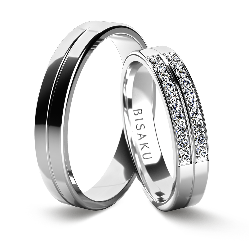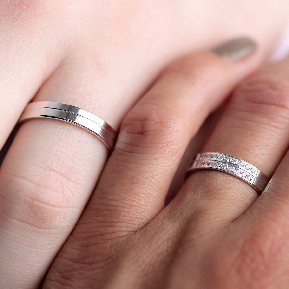 Schlicht, elegant und dabei unübersehbar. Der Damenring besticht mit zwei Reihen Edelsteinen auf einem Drittel des Rings. Den Herrenring ziert eine mittig angeordnete, schmale Linie.