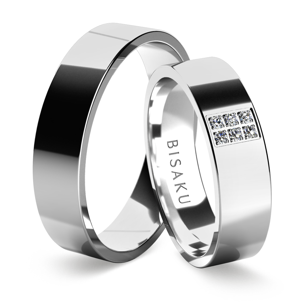 Eheringe in Hochglanz-Optik mit Edelsteinen eingefasst in zwei vertikalen Linien. Dieses Modell fertigen wir aus Weißgold, Roségold, Gelbgold und Platin.