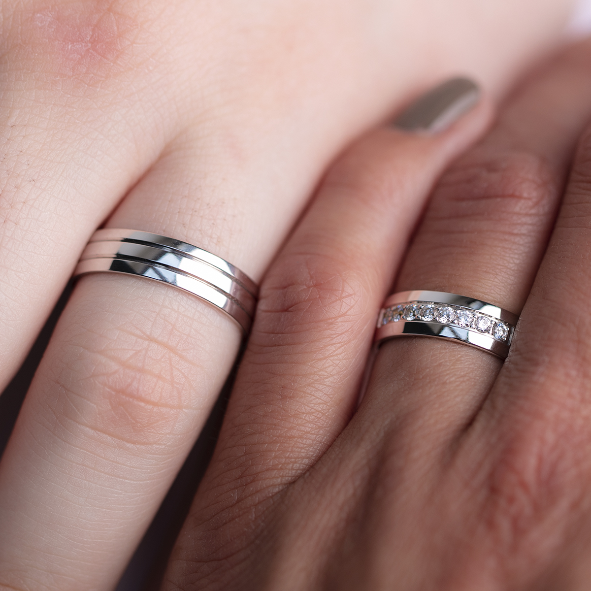Der Damenring in Hochglanzoptik ist mit außergewöhnlich funkelnden Edelsteinen besetzt. Der Herrenring besticht hingegen mit gleich zwei schmalen Rillen. Die Herren-Variante dieses Modells gehört zu unseren Bestsellern.