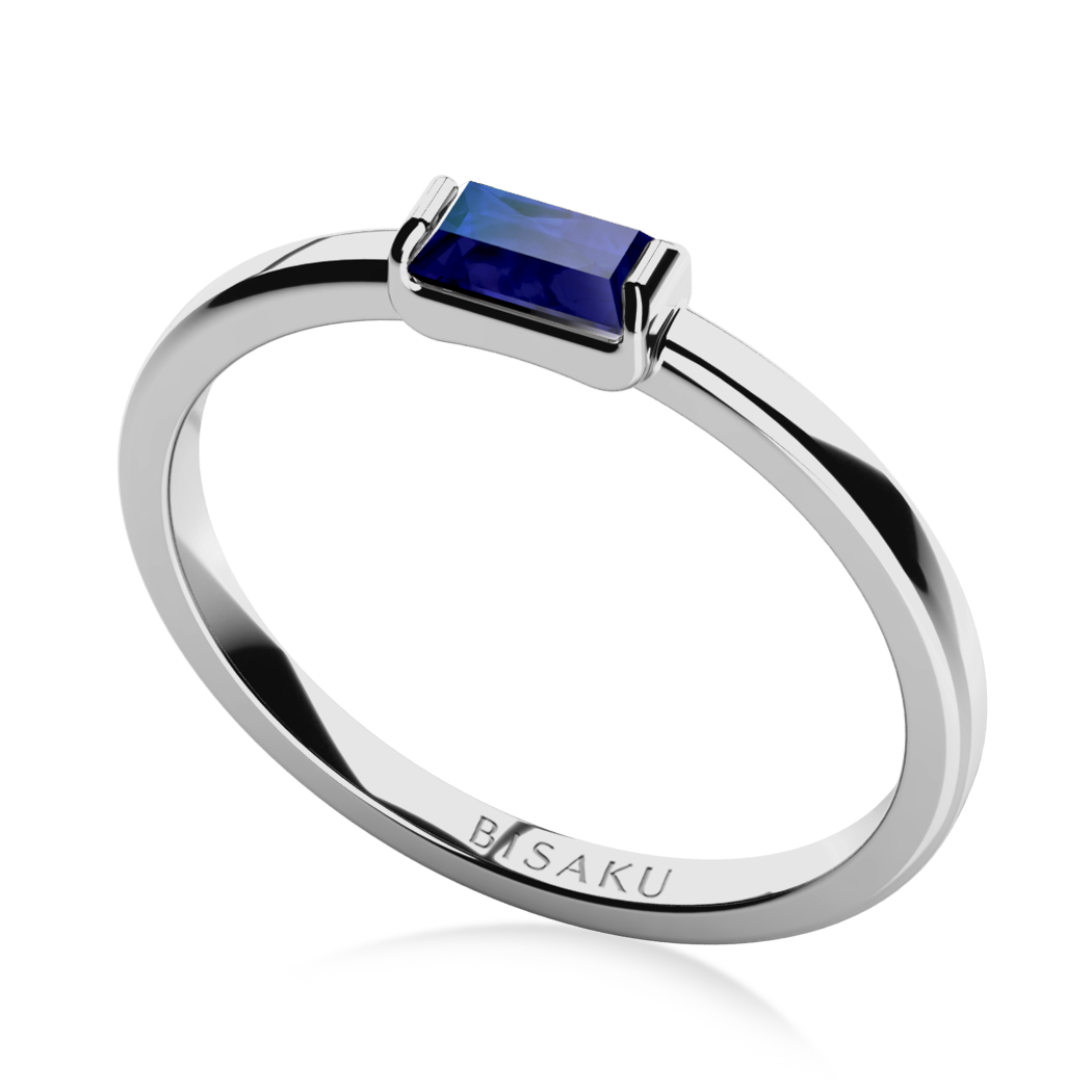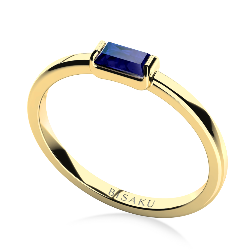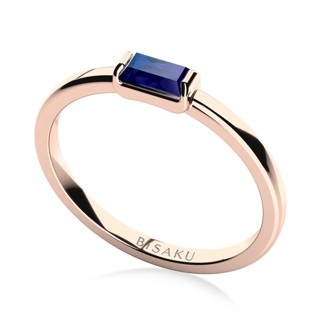 Ein feiner Ring mit einem blauen Saphir im Baguette-Schliff besticht durch klare Linien und ausgewogenes Design. Eine dezente Alternative zum Modell Diane mit Diamanten auf der Ringschiene. Ideal für alle, die Schlichtheit schätzen. Bitte geben Sie in der Anmerkung die gewünschte Goldfarbe an.