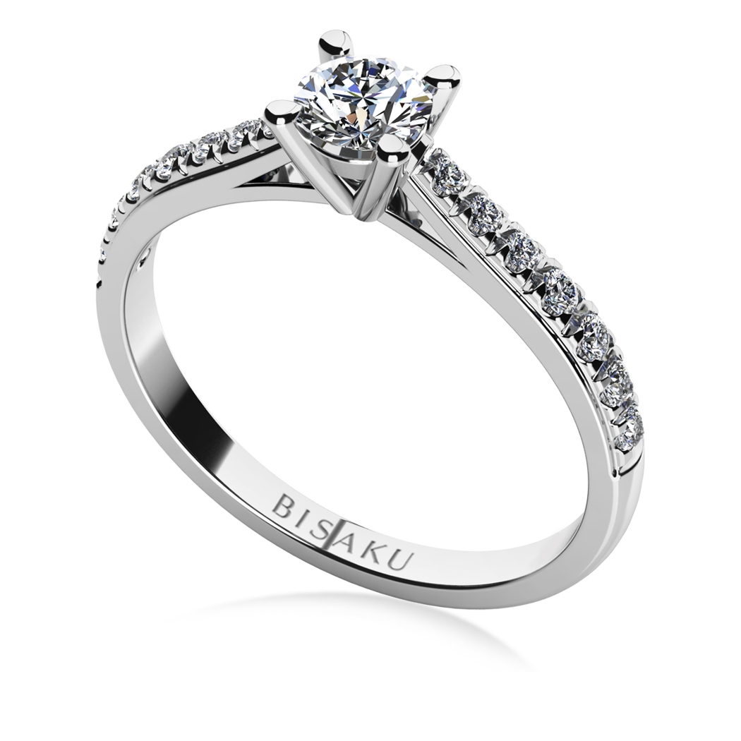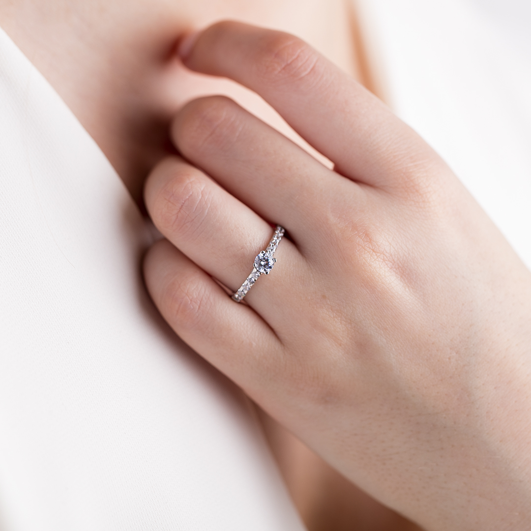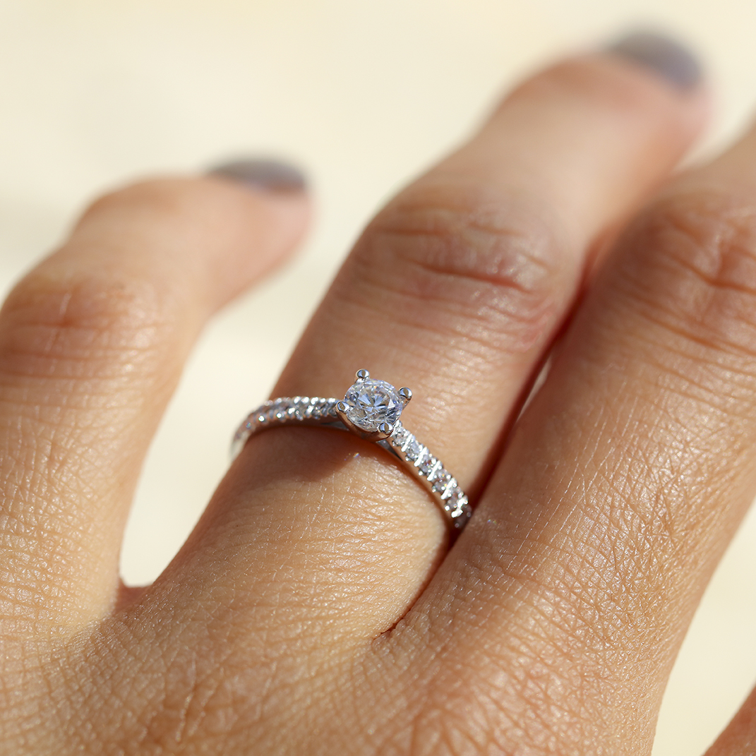 Dieser elegante Verlobungsring ist am gesamten Umfang mit Edelsteinen besetzt. Und zeichnet sich am Finger durch schimmerndes Funkeln aus.