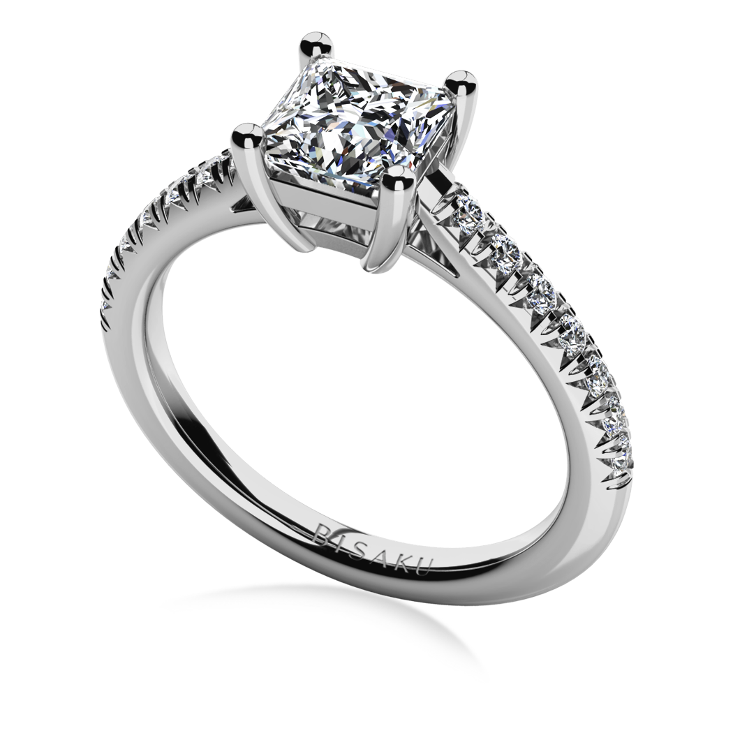 Um den Solitärstein im Princess-Cut optisch hervorzuheben, haben wir die Ringschiene mit kleinen Steinen besetzt. Die präzise Fassung in ungewöhnlichem Design ist zudem ein echter Hingucker. Passend dazu haben wir die Eheringe KAYLA entworfen.